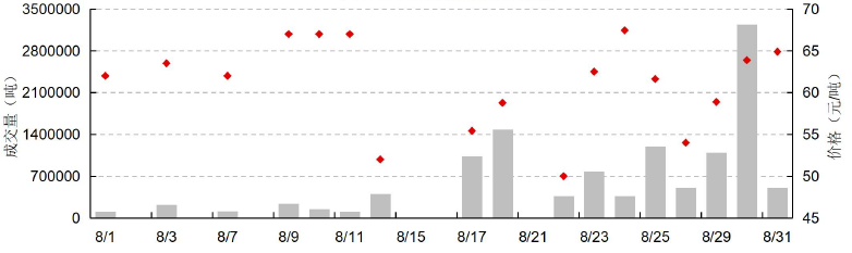 8月CEA大宗协议交易成交1193.9万吨,成交均价区间50-67.45元/吨,加权均价60.73元/吨,较挂牌协议交易均价低12%。